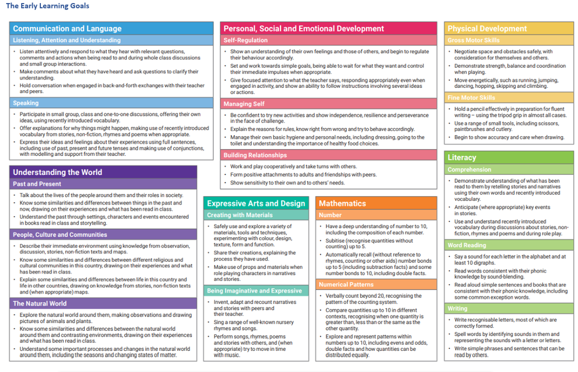 The Early Learning Goals (ELGs) are the goals or targets children are expected to achieve at the end of their reception year. These are an end point measure of what a child should be demonstrating at the end of the Early Years Foundation Stage. There are 17 ELGs across all the areas of learning. As shown below.